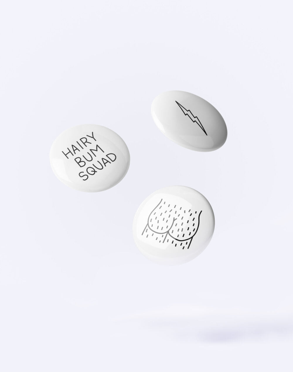 Step up your accessory game with the Butt-Ons - Hairy Bum Squad pinback button set from Dicks Donât Lie. This set of three glossy buttons features quirky designsâa lightning bolt, a cheeky hairy bum, and the bold text "HAIRY BUM SQUAD." Perfect for adding a touch of playful irreverence to any outfit or accessory.