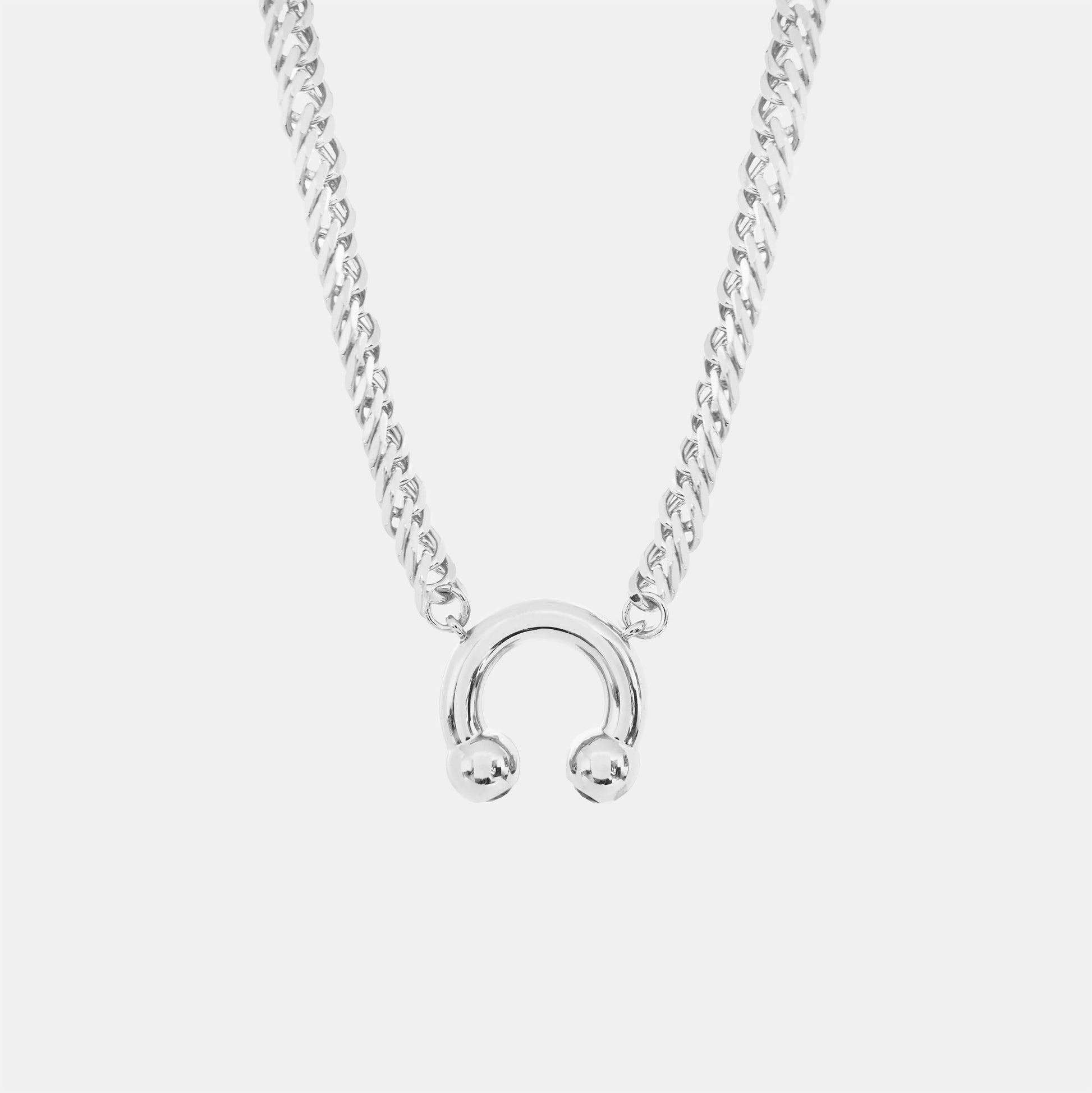 Hoemo World introduces the Prince Albert Chunky Pendant Necklace in sleek silver. This striking piece features a circular barbell design inspired by premium PA piercings, complete with dazzling Cubic Zirconia accents. Engraved with Hoemo World branding on the reverse, this oversized pendant on a chunky chain is both a statement of style and a subtle nod to queer culture, perfect for those who know.